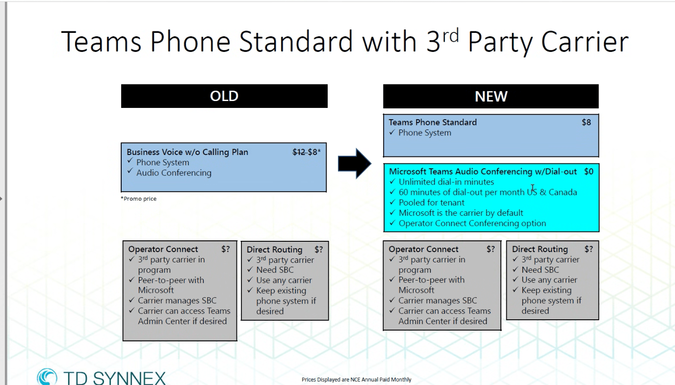 Most of the licensing that I had ordered was Business Voice w/o calling plan. This was used for Teams Direct Routing. This is now being replaced with Teams Phone Standard license and apparently another license that is a 0 cost item to allow for Audio Conferencing.